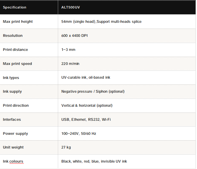 Both systems print QR codes, Data Matrix codes, GS1-128 barcodes, PDF417, and any variable or fixed text linked to an external database. The ALT500UV additionally supports invisible UV ink codes for covert authentication applications.