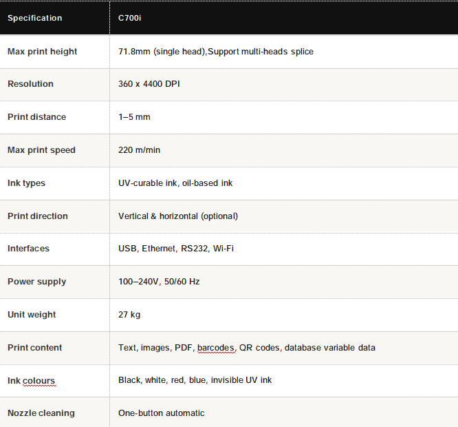 Two machines, two jobs. If you're printing directly onto flexible food packaging — plastic film, OPP, foil — at speeds above 200 packs per minute, you need the ALT500UV. If you're coding corrugated cartons or master cases on a logistics or distribution line, the C700i is the right tool. They're not interchangeable, and I'll explain exactly why below.