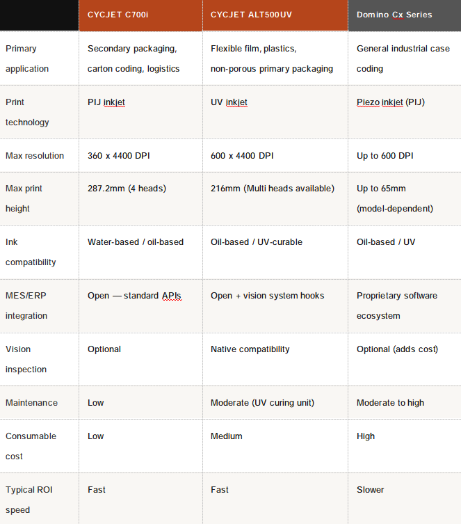 Alt text: ALT500UV vs C700i vs Domino Cx Series