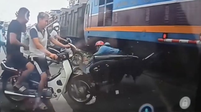 The driver crashes into fellow bike riders waiting behind the barriers on the other side (Picture: Jam Press)Accidents are frequent. In February a lorry driver was killed after his vehicle was hit by a train travelling through the city.On March 8,a motorbike rider was killed after trying to circumvent the safety barrier at a crossing.Hanoi’s famous Train Street carries railway vehicles several times a day on its single-track line.The narrow road is lined with shops and homes and is a popular attraction for visitors looking for an iconic photo grab.The distinctive railway line forms part of the north-south route through the city and was built under French colonial rule.