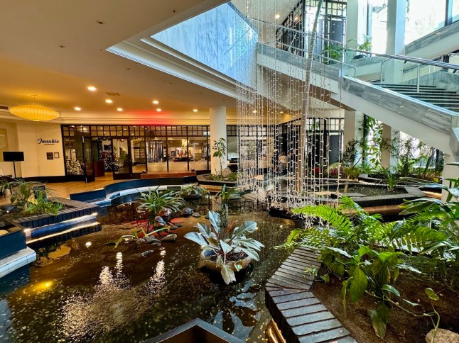 The water in the fish pond the man fell into,thought to be two floors below street level by a hotel buffet restaurant,was only about 15 inches deep.