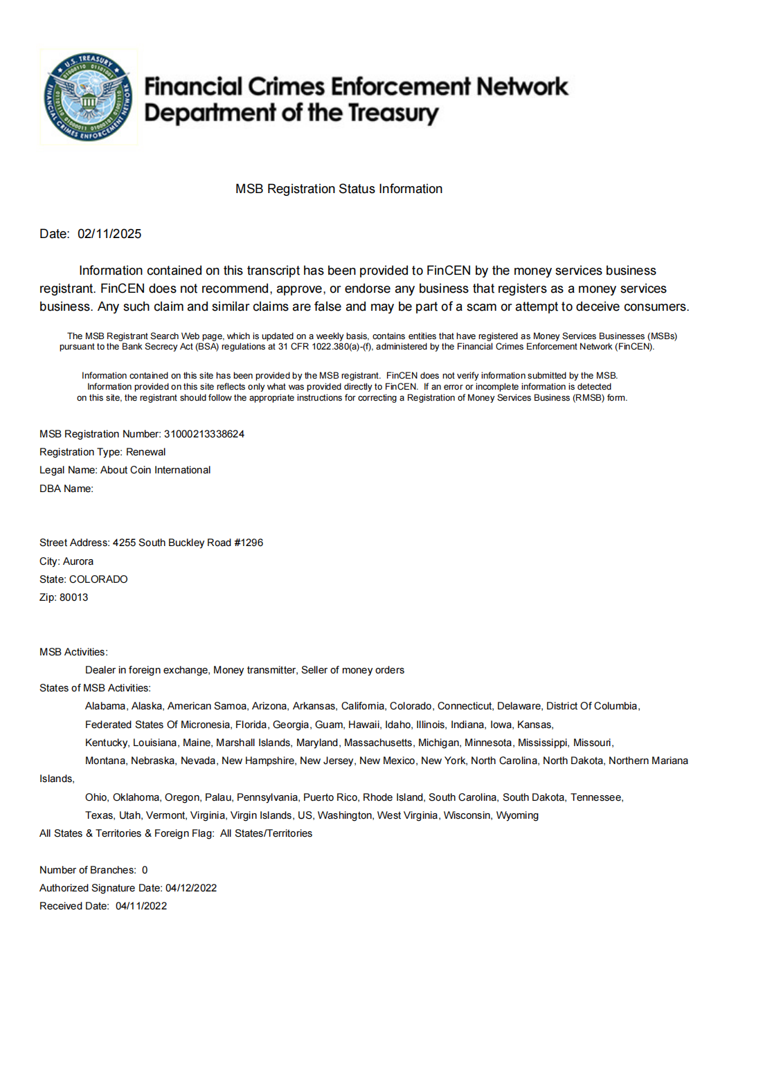 ✅ About Coin International has obtained the MSB (Money Services Business) license issued by the U.S. Treasury Department FinCEN, and is qualified to legally operate virtual currency trading services in the United States!