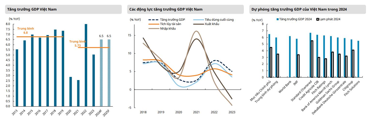 Maybank Research forecasts that Vietnam's GDP growth will recover in 2024 and 2025, at 4.5% and 4.7%, respectively, compared to 4% in 2023, while ING Think forecasts Vietnam's GDP growth in 2024 is 6%, one of the highest growth rates in the region and is expected to increase to 6.5% by 2025.
