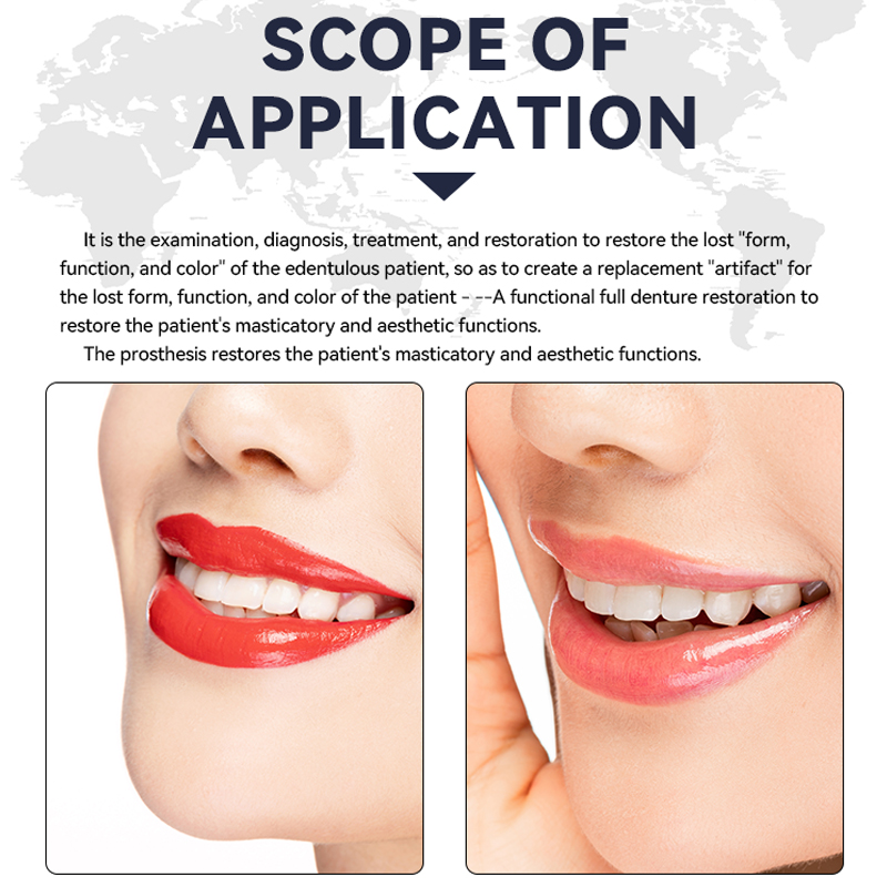 It is the examination, diagnosis, treatment, and restoration carried out to restore the lost "form, function, and color" of edentulous patients, in order to create an alternative "handicraft" - functional complete denture restoration for the lost form, function, and color of patients, in order to achieve the goal of restoring their chewing function and aesthetic function. This restoration restores the patient's chewing function and aesthetic function.