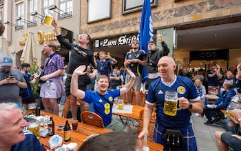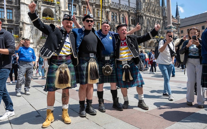 Craig Ferguson (right),who has walked from Scotland to Germany for Euro 2024 at Marienplatz central square,MunichCredit: Martin Rickett/PAMr Ferguson,who raised £50,000 for charity,initially did not have a ticket to the game but has now been given one by a supporter.“I think it makes the walk and all those miles a little bit less crazy the fact that I will now actually be going to the game,” he said.“I started this journey with just me,my bag,no ticket,no nothing,Just a stupid idea and well,fast-forward,you know,41 days,here I am.”The bars are not the only thing drying up. Scotland’s kiltmakers are bemoaning a lack of tartan as thousands snap up “drinking kilts” for the tournament.Some outfitters have “completely run out” of stock as canny fans opt for ex-hire kilts,a cheaper alternative to the traditional dress.David Hughes,62,owner of Bowdens,in Leith,Edinburgh,said he has been forced to turn eager buyers away after he ran out of stock last week.He said: “We have completely run out. I’m turning guys away,two or three a day,asking for an ex-hire kilt. It’s brilliant for business,I just wish I had more. We ran out about a week ago.“On average an ex-hire kilt is anything between £100 and £150 and we have sold about 45 kilts. This is actually the best it’s ever been for us because it’s been such a long time since Scotland were actually in a tournament.”Ken MacDonald,65,owner of Kilts for Hire Paisley,also known as the Houston Kiltmaker in Paisley,said: “Basically,a lot of folks have got good kilts and they don’t want to take their good kilts with them,so they are happy to buy an ex-hire kilt or what we would call a drinking kilt.”Meanwhile,back in Munich,others to descend this morning were Shaun Barber,61,and his two sons Kyle,37,and Grant,35,who came from Dundee and were met by Mr Barber’s daughter Jess who had made a surprise decision to join them from Melbourne.None had slept as they drank pints in Marienplatz at 10am,after a few vodkas on the train overnight from Frankfurt.“We’d just got here when I got a tap on the shoulder and it was Jess,over from Australia,” Mr Barber,a retired sales director from Dundee,said.“I didn’t know anything about it. It was the best weekend ever. I know we’re going to beat Germany but now that’s not even the highlight. At some point we will need to find a hotel.”Scotland did qualify for the last European Championships but Covid restrictions meant fans were unable to go on tour across Wembley.“There’s a lot of fountains here,it’s going to be like Trafalgar Square on steroids,” Mr Barber said,referring to previous antics by Scotland fans who put washing up liquid in the fountains around Nelson’s Column.“This is the first time Scotland have been on tour since France 98,it’s the biggest party in 26 years. We are going to go home after the group stages and then we will be back to see Scotland in the final.”His daughter added: “I only decided to come two weeks ago,two flights,two trains but it’s worth it.”