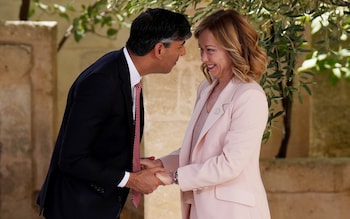 Rishi Sunak and Giorgia Meloni look happy to see each other at the G7 summit in Bari