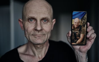 A Ukrainian soldier holds a picture of himself showing what he looked like before being taken captive by Russian forces