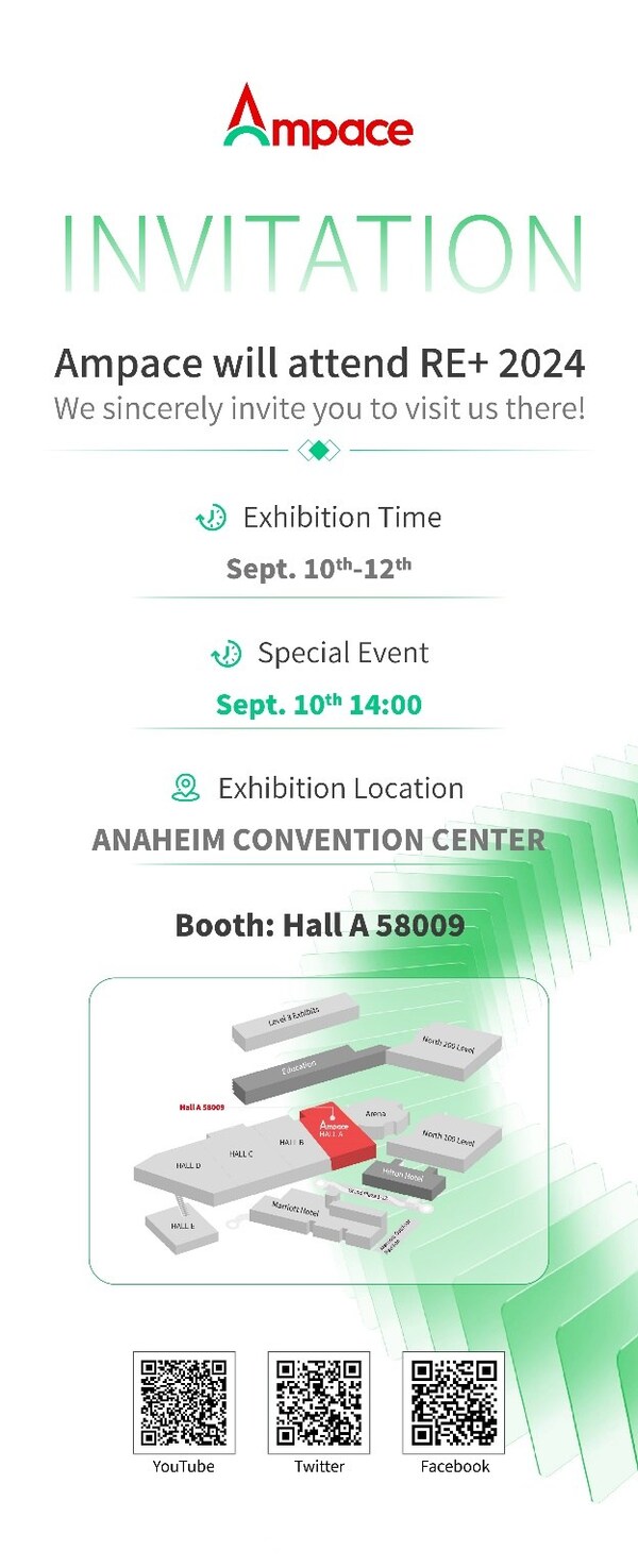 ANAHEIM,Calif.,Sept. 2,2024 -- With the rapid development of technology,innovative energy solutions are becoming the focus of global attention. As a new energy technology innovation company,Ampace committed to delivering green energy solutions with ultimate user experience to forge the world ahead and empower a better life. This time,Ampace will present its UniC series products,featuring the innovative "Zero Liquid Cooling and Zero Air Conditioner" technology,at RE+ 2024 (Booth Number: 58009).