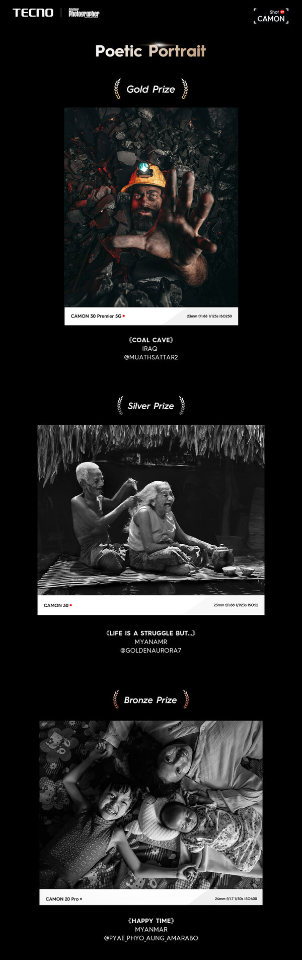 In the Poetic Portrait category,the winning shots present the poetic beauty of portrait photography from diverse perspectives. The Gold Award-winning piece uses unique composition and lighting to capture the resolute expression of a miner,showcasing the resilience of the human spirit in adversity. The Silver Award-winning work portrays an elderly couple's playful moment,reflecting pure happiness in simple living. The Bronze Award-winning photograph depicts warm family moments,conveying the tenderness and bonds of everyday life.