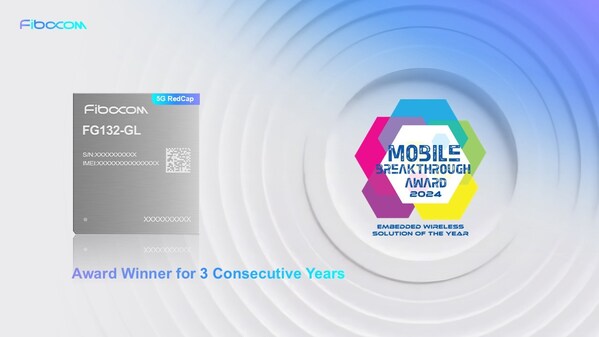 SHENZHEN,China,Oct. 25,2024 -- Fibocom (Stock code: 300638),a global leading provider of IoT (Internet of Things) wireless solutions and wireless communication modules,today announces that the 5G RedCap module FG132 has been awarded as the "Embedded Wireless Solution of the Year" in 2024 Mobile Breakthrough Award. The prestigious international awards program honors top mobile and wireless companies and solutions around the globe,Fibocom's innovative,high-performance 5G RedCap (Reduced Capability) module equipped with the latest antenna design and power utilization technologies is honored to be selected as the winner through thousands of nominations from over 15 countries,marking the third consecutive win in this program.
