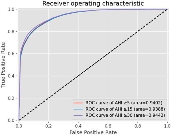 SOMNUM also demonstrated excellent predictive accuracy for sleep apnea across all severity levels. The AUC (area under the ROC curve) scores for disease prediction in mild,and severe groups were 0.9402,0.9388 and 0.9442,respectively,with no significant differences among the groups.