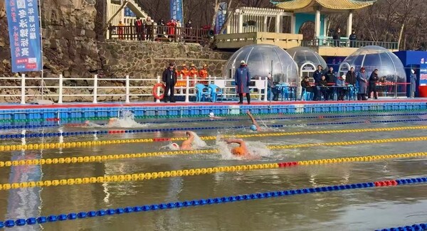 Photo shows that the 28th National Winter Swimming Championships in 2024 is held at Jingpo Lake Scenic Area in Mudanjiang City of northeast China's Heilongjiang Province.