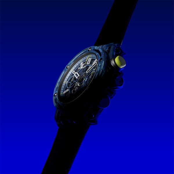 The composite that makes up the case and bezel of the watch is made of Epoxy resin reinforced with quartz powder and glass veil that has been fused with the recycled rackets and shirts. The resulting material is speckled with fragments of light & dark blue textiles and black carbon to create a singular camo aesthetic. An innovative approach,representative of Hublot's ambition for endless reinvention.