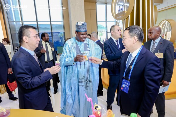 Babagana Wakil,chargé d’affaires of the Embassy of the Nigeria in China,talks with Li Zhenhuan and Zhang Weidong,general manager of Shanxi Xinghuacun Fenjiu International Trade Co.,Ltd. at the Fenjiu booth during the GCCAC