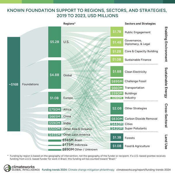 Known foundation support to regions,sectors,and strategies from 2019 to 2023 in USD millions. (ClimateWorks Foundation Funding Trends 2024)