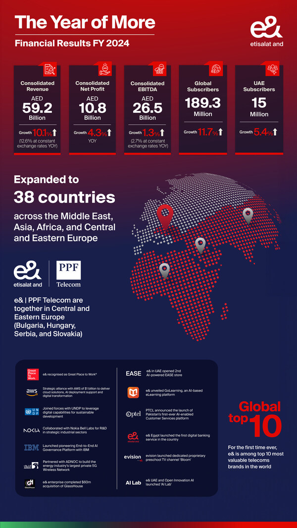 H.E. Jassem Mohamed Bu Ataba Alzaabi,Chairman,e&,said: "2024 was a year of growth,driven by bold vision,AI-driven innovation,and relentless commitment to digital empowerment. Emerging as the "World's Fastest Growing Brand" and establishing our first operational footprint in Europe were defining moments in e&'s journey. With a net profit of AED 10.8 billion and subscribers growing to 189.3 million,our performance reflects our strategic foresight and unwavering focus on value creation.