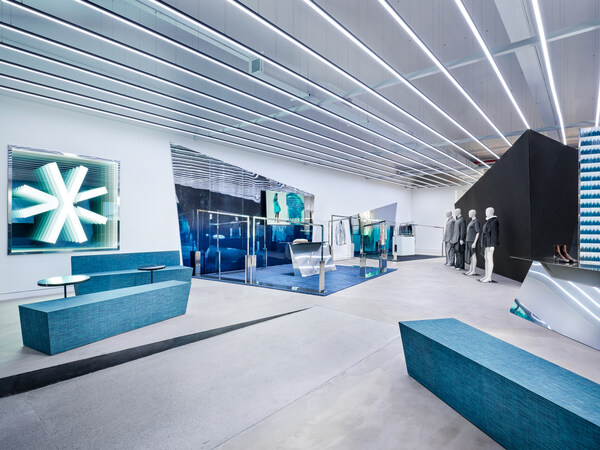 The space features DMX lighting and modern displays that respond dynamically to the background music,creating a captivating visual experience. Movable,independent modular showcases house a curated mix of pieces from global designers,including Martine Rose,KidSuper,Hed Mayner,JUUN.J,RECTO,and Post Archive Faction,and can be reconfigured for runway shows and DJ parties. Sleek,super-mirror metal sculptures and witty furniture designs in striking colors add distinct energy to the space. A centrally located mystery box promises intriguing interactions between shoppers and the environment,ultimately focusing on facilitating brand growth while embracing designers' aspirations for innovation and originality.