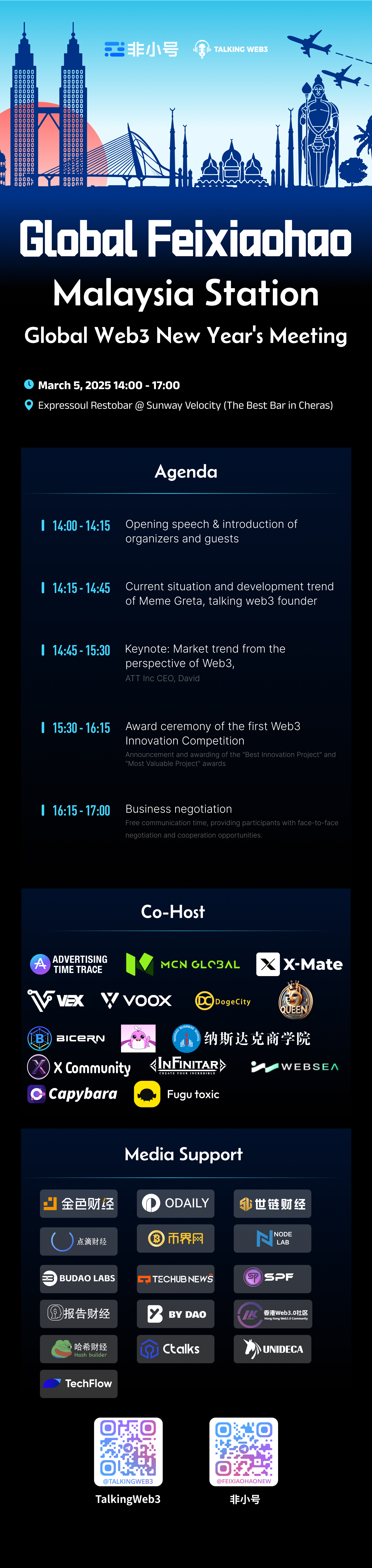 On March 5, 2025, the Global Feixiaohao | 2025 Web3 New Year's Meeting will take place at Sunway Velocity, Malaysia! This prestigious event, co-hosted by Feixiaohao, Talking Web3, and the Nasdaq Business School, will bring together industry leaders, top-tier projects, investment institutions, and Web3 communities worldwide. The event will focus on key Web3 topics, including Decentralized Finance (DeFi), Real-World Asset (RWA) tokenization, GameFi, NFTs, and Web3 financial infrastructure.