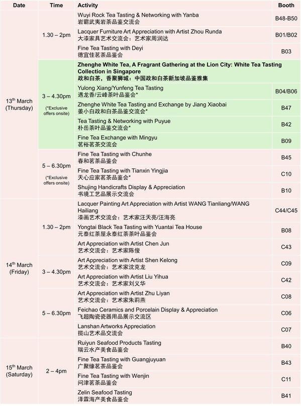On top of exclusive event offers,the exhibition will also host tea tasting sessions and art appreciation exchanges with renowned Chinese artists (see Activity Table at end). The first 200 visitors to the exhibition counter each day can also collect a complimentary premium tea towel,specially designed and highly absorbent,while stocks last.