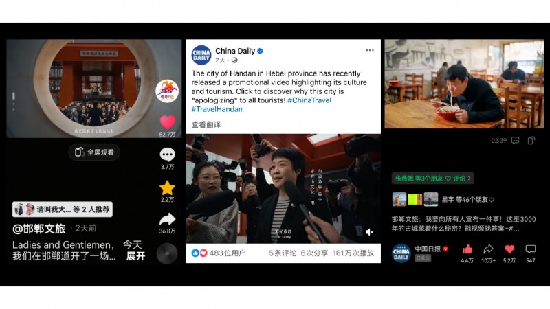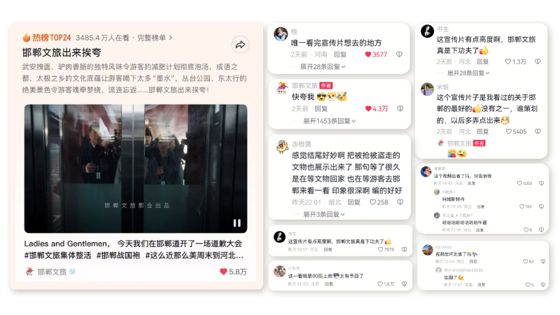 Reportedly, after being shared on China Daily’s Facebook page, the video surpassed 400,000 views within 24 hours. On China Daily’s WeChat video channel, it received over 100,000 interactions and more than 2 million views. On Douyin, the trending topic #HandanTourismComeOutAndAcceptCompliments# had over 40 million online views. As of this article’s release, Douyin interactions exceeded 900,000.