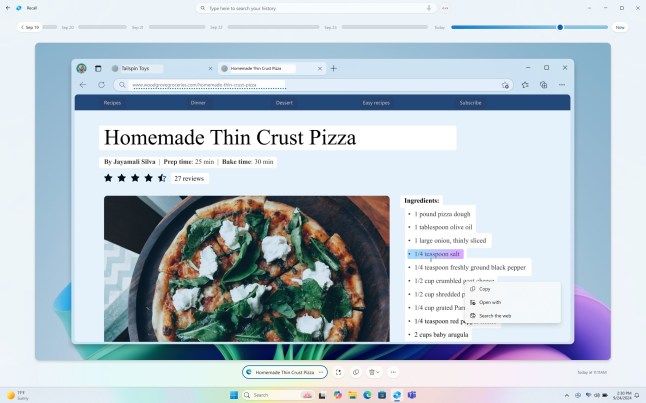 An example Microsoft gave is: ‘Maybe you wanted to make that pizza recipe you saw earlier today but you don’t remember where you saw it. Typing thin crust pizza into the search box would easily find the recipe again. You could also search for pizza if you didn’t remember the specific type of pizza.’
