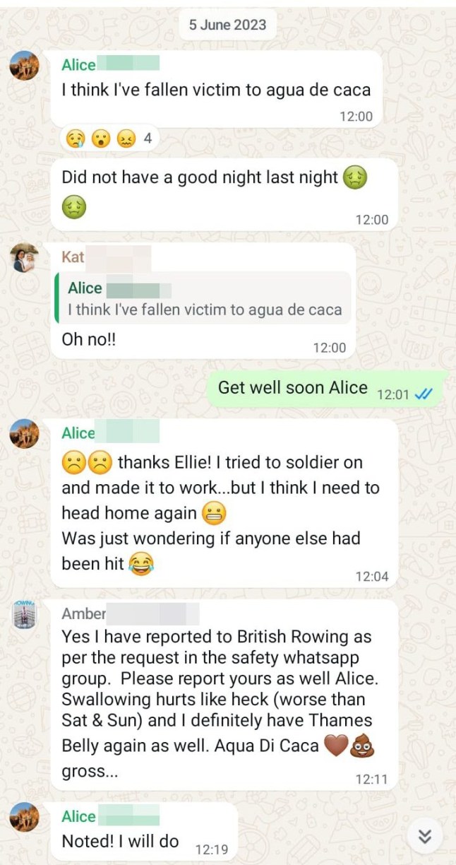 Whatsapp messages between rowers from the club discussing how they became sick simultaneously