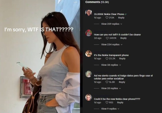 What appears to be a crystal clear iPhone is in her right hand. The device has gone viral online,with one user sharing a photo and asking,‘I’m sorry,WTF is that??’