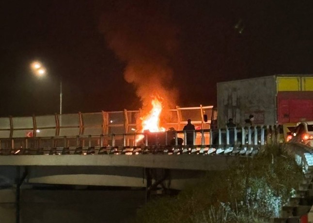 Footage from the scene shows the vehicle overturned on its roof and engulfed in flames,with wads of Russian ruble notes littering the road.